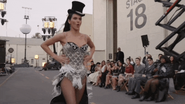 Kendall Jenner 身着《红磨坊》原版戏服,带着Tiffany&Co.的耳环,华丽的羽毛与亮片在灯光下闪烁,每一个旋转都像银幕般华丽。