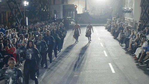 模特身穿Balmain服装,灵感源自Ruth E. Carter为《黑豹》打造的战服,色彩鲜明、工艺繁复,彰显权力与存在感。Carter回忆Chadwick Boseman初次穿上战服时的震撼:“那是庄严的力量,像超级英雄降临。”