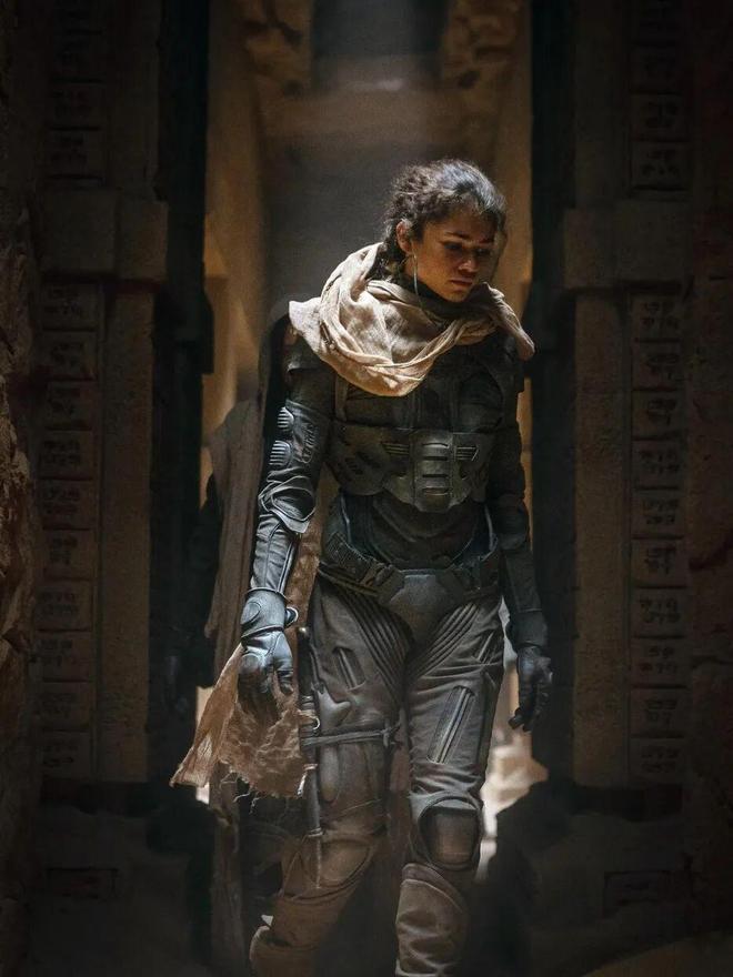 模特身着 Jacqueline West为Chani设计的《沙丘》蒸馏服,黑色长袍与精细裁剪呼应电影中的姐妹会的角色。