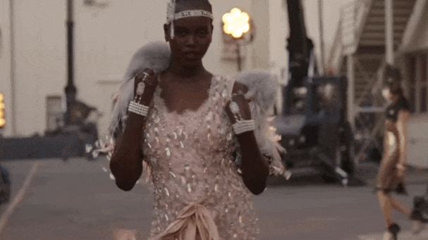 模特化身Daisy Buchanan,身着定制Miu Miu——灵感源自Catherine Martin与Miuccia Prada合作为《了不起的盖茨比》打造的戏服。布料闪烁着微光,剪裁复刻了二十年代的精致轮廓,同时注入了现代感与女性情绪的细腻层次。