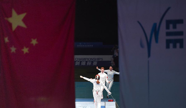 世界排名第一的中国女子重剑队7月25日没能打进2018世界击剑锦标赛女团决赛,半决赛她们以21:25不敌韩国队,三四名决赛中国队以45:42战胜俄罗斯队,获得中国队本届世锦赛的首枚奖牌。美国队和韩国队分获女子重剑和男子佩剑团体冠军,中国男重则通过两轮淘汰赛打进团体八强。图为中国队选手在赛后庆祝。