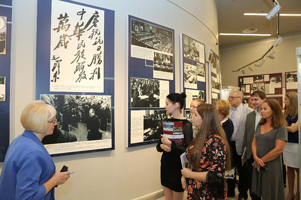 7月25日,在白俄罗斯首都明斯克的伟大卫国战争历史博物馆,人们参观“东方主战场”展览。由中白两国共同举办的“东方主战场”展览,25日在白俄罗斯首都明斯克的伟大卫国战争历史博物馆开幕。本次展览共展出55件历史文物和140余幅珍贵历史图片,展现了中国人民为世界反法西斯战争的胜利做出的巨大民族牺牲和历史贡献。