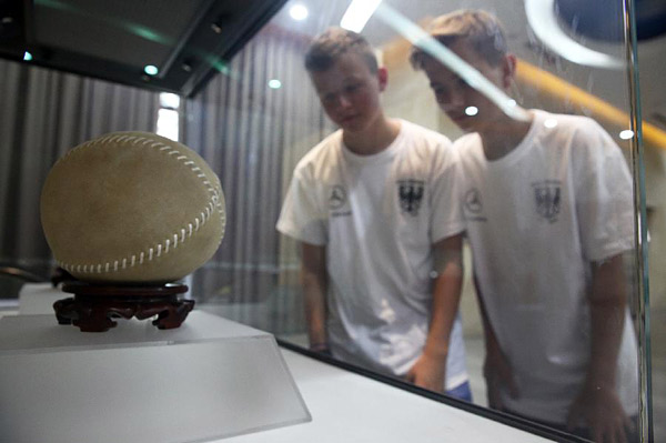 7月25日,德国青少年在临淄足球博物馆观看蹴鞠展品。 为期6天的2018年国际青少年足球夏令营暨第四届中国临淄蹴鞠推广大赛正在世界足球起源地山东省淄博市临淄区举行,来自德国、韩国以及国内的8支青少年男子足球队参加。中外青少年在足球场上切磋技艺,共同体验中国蹴鞠文化。